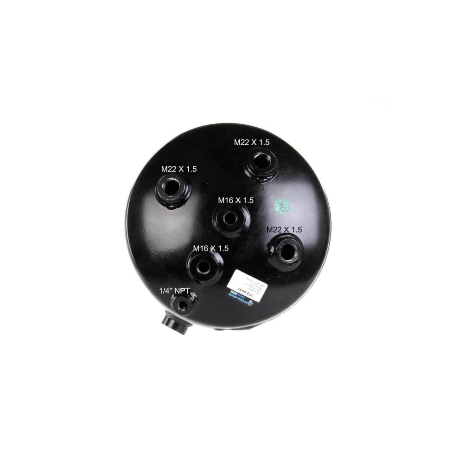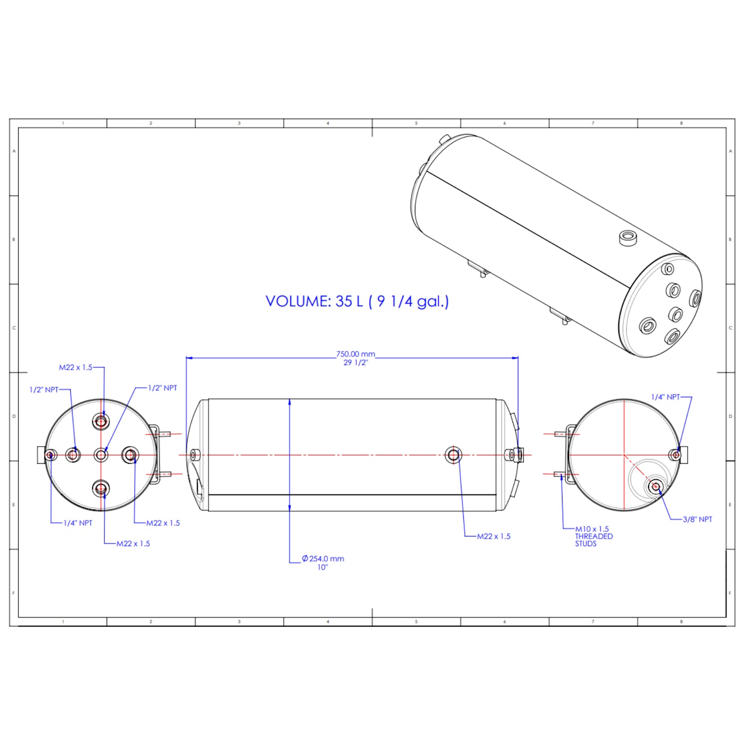 Tank diameter: 10 inches. Length: 29.5 inches. Wall thickness: 0.13 inch. Capacity: 35 liters. Maximum working pressure: 150 PSI. Features 9 ports with thread sizes: 1/4 inch (2), 3/8 inch (1), M22 (4), and 1/2 inch (2). Mounting hardware not included.