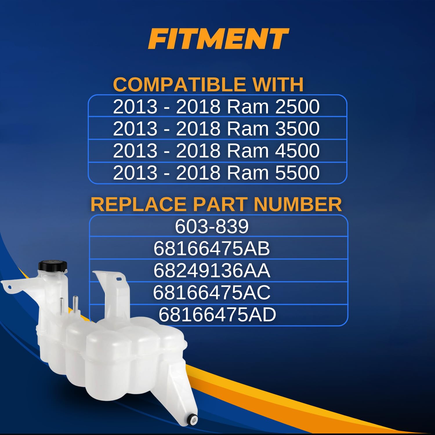Ensure optimal cooling system performance for your 2013–2018 Dodge Ram 2500, 3500, 4500, and 5500 with the TORQUE Engine Coolant Tank Reservoir. Designed as a direct replacement for OEM part numbers 603-839, 68166475AB, 68166475AC, and 68166475AD, this high-quality reservoir exceeds OEM standards for durability and reliability.